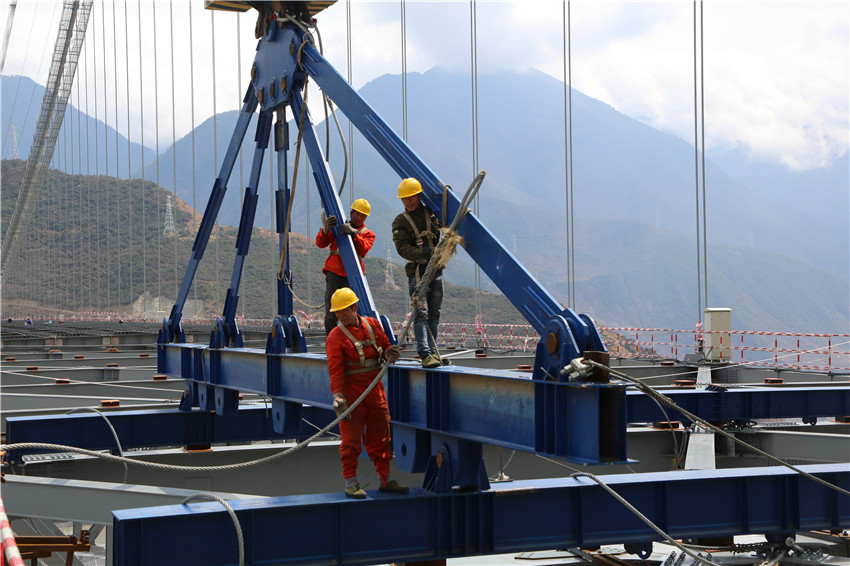 興康特大橋作為高海拔、高地震烈度山區(qū)和復(fù)雜風(fēng)場環(huán)境下世界第一超大跨徑鋼桁梁懸索橋,面臨的最現(xiàn)實的困難就是復(fù)雜風(fēng)場。4月1日下午,大橋建設(shè)現(xiàn)場連綿不絕的大風(fēng)如期而至,工人們系上安全繩,迎著大風(fēng),對新吊裝的材料一個螺絲一個螺絲的擰緊。