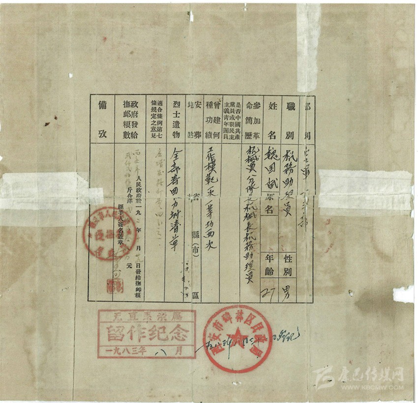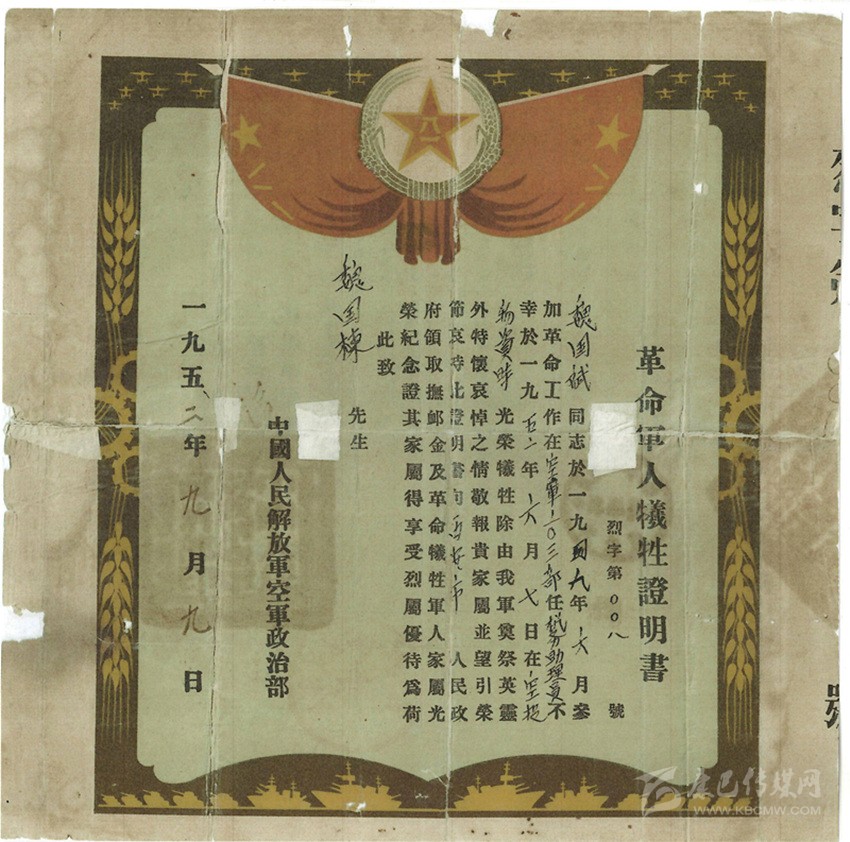 魏國(guó)賓的革命軍人犧牲證明書(shū)。