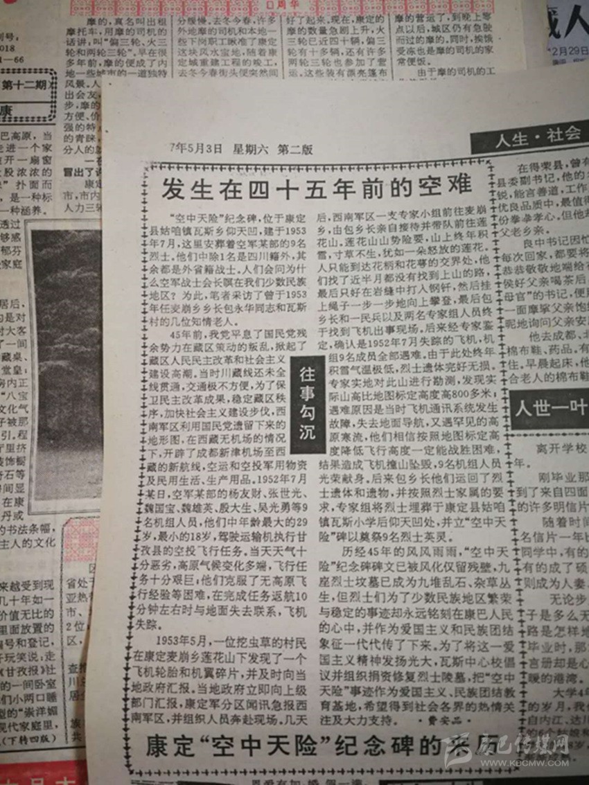 《甘孜日?qǐng)?bào)》1997年5月3日第二版刊登了《發(fā)生在四十五年前的空難——康定“空中天險(xiǎn)”紀(jì)念碑的來(lái)歷》一文,詳細(xì)記錄了1952年空軍某部9名人員駕駛運(yùn)輸機(jī)執(zhí)行空投飛行任務(wù),不幸在康定地區(qū)撞山墜毀,英勇?tīng)奚墓适?。這9名烈士后被當(dāng)?shù)厝罕姲苍幔ⅰ翱哲娔埂焙汀翱罩刑祀U(xiǎn)”紀(jì)念碑。 作為烈士犧牲地的甘孜多年來(lái)一直在尋找這9名烈士家屬,以圖告慰英靈。但由于線索有限,一直未有結(jié)果。