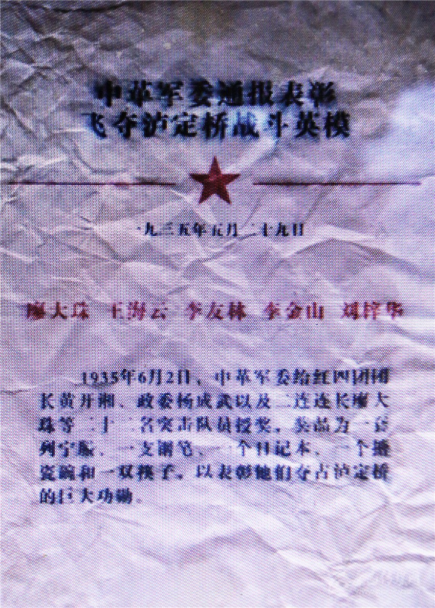 劉東升談起父親當年作為飛奪瀘定橋22勇士之一,心情無比激動。“父親當年如果不是努力爭取,就沒有后來的勇士稱號,更沒有中革軍委的嘉獎。”1935年5月,北上抗日的紅軍向天險大渡河挺進。大渡河水流湍急,兩岸都是高山峻嶺,只有一座鐵索橋可以通過。這座鐵索橋,就是紅軍北上必須奪取的瀘定橋。
