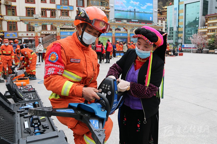 州森林消防支隊隊員向市民展示救援工具。