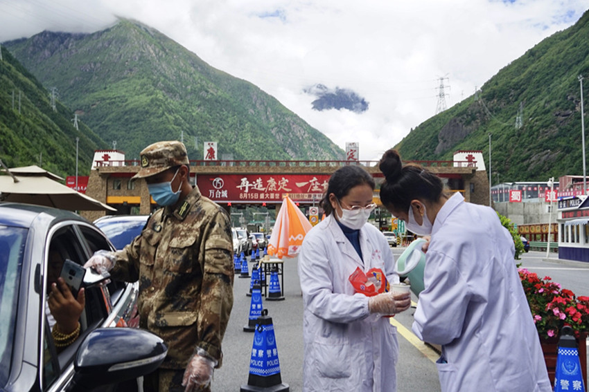地震又遇疫情。大量救援隊進入災(zāi)區(qū),加大了當(dāng)?shù)匾咔榉揽氐膲毫?。為減輕當(dāng)?shù)胤酪邏毫Γ?月6日,州藏醫(yī)院再次抽派8名醫(yī)務(wù)人員組成兩支核酸采樣隊,奔赴瀘定縣得妥鎮(zhèn)火線支援疫情防控工作。核酸采樣隊到達目的地后,在應(yīng)急指揮部的安排下,迅速投入到了緊張有序的采樣工作中。截止撤離時,共為當(dāng)?shù)亻_展了1萬余人次的核酸采樣。