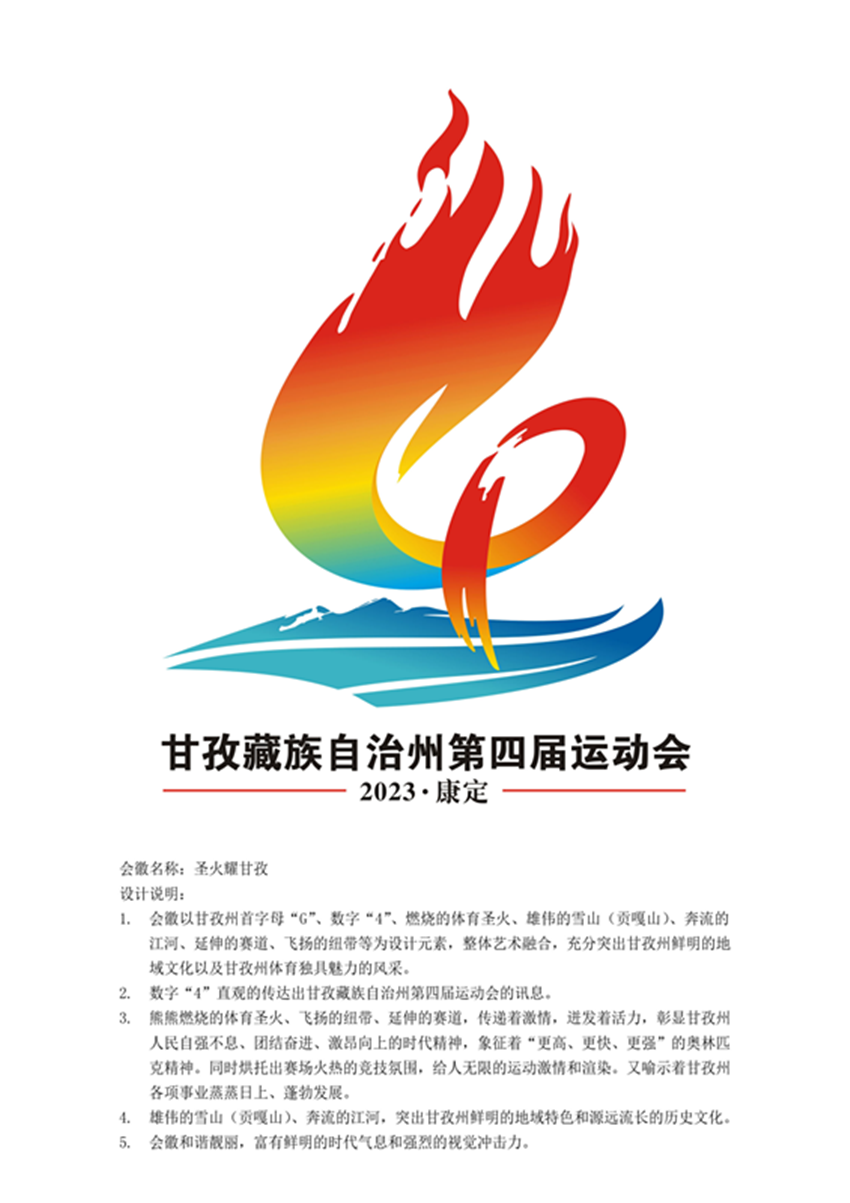 據(jù)王拓進(jìn)介紹,會(huì)徽設(shè)計(jì)靈感來自網(wǎng)上看到的貢嘎雪山,所以作品以甘孜州首字母“G”、數(shù)字“4”、燃燒的體育圣火、雄偉的雪山(貢嘎山)、奔流的江河、延伸的賽道、飛揚(yáng)的紐帶等為設(shè)計(jì)元素。數(shù)字“4”直觀地傳達(dá)出甘孜州第四屆運(yùn)動(dòng)會(huì)的訊息;雄偉的雪山(貢嘎山)、奔流的江河,突出甘孜州鮮明的地域特色和源遠(yuǎn)流長(zhǎng)的歷史文化;熊熊燃燒的體育圣火、飛揚(yáng)的紐帶、延伸的賽道,傳遞著激情、迸發(fā)著活力,彰顯甘孜州人民自強(qiáng)不息、團(tuán)結(jié)奮進(jìn)、激昂向上的時(shí)代精神,象征著“更高、更快、更強(qiáng)”的奧林匹克精神,同時(shí)烘托出賽場(chǎng)火熱的競(jìng)技氛圍,給人無(wú)限的運(yùn)動(dòng)激情和渲染,又喻示著甘孜州各項(xiàng)事業(yè)蒸蒸日上、蓬勃發(fā)展。