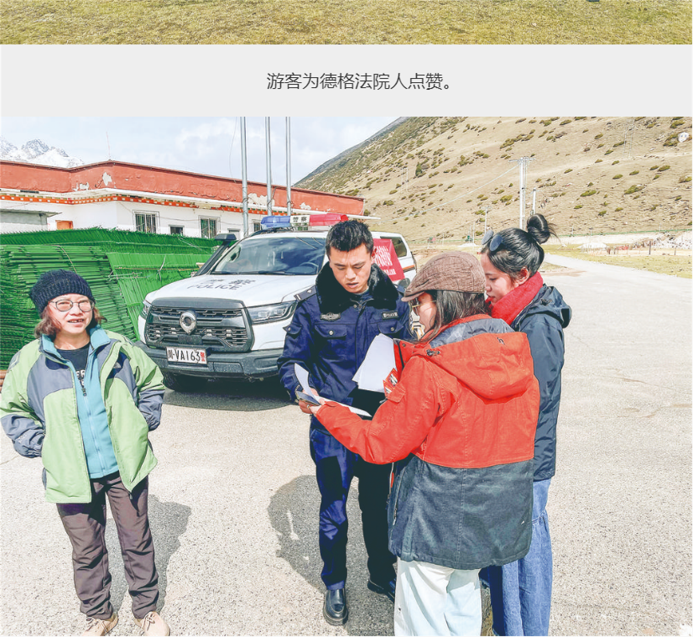 考慮到玉龍拉措景區(qū)與德格縣城區(qū)之間距離較遠(yuǎn),為了確保游客能及時(shí)享受到便捷且高效率的司法服務(wù),馬尼干戈法庭的工作人員專門設(shè)立了景區(qū)旅游訴訟服務(wù)點(diǎn)。這個(gè)點(diǎn)位全天候開放,以最貼心細(xì)致的服務(wù),全方位滿足游客的司法需求,為遇到旅游糾紛的游客答疑解惑,與景區(qū)工作人員、攤點(diǎn)商戶交流,了解他們的法律需求,向其宣傳《旅游法》《價(jià)格法》等涉旅法律知識。同時(shí),該法庭工作人員還當(dāng)起了景區(qū)臨時(shí)“導(dǎo)游”,為游客介紹轄區(qū)乃至全縣的景區(qū)景點(diǎn),提供吃、住、行等方面的游玩資訊,獲得了游客們的一致好評和點(diǎn)贊。