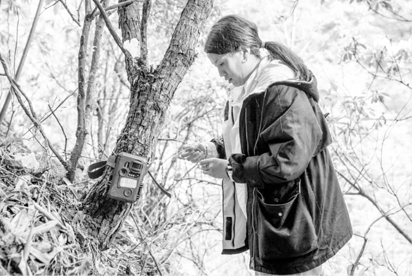 蹲下來,陳妍君把紅外相機綁在樹干靠下的位置。往鏡頭朝向看去,5米開外,另一位隊員正半蹲著對著相機?!拔覀儼攵紫聛淼母叨群蛣游锊畈欢喔?,這個視線拍過去就能覆蓋整個區(qū)域了?!标愬{(diào)整好相機位置后,打開開關(guān),掏出手機,拍下具體的安裝位置。