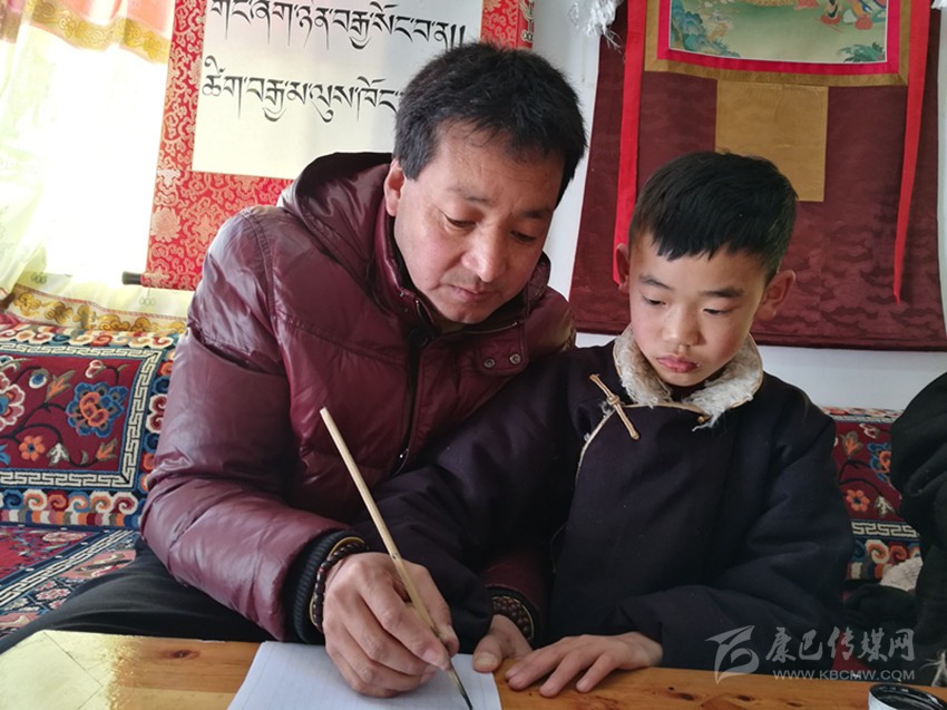 本網(wǎng)訊(余應(yīng)瓊 文/圖)“使用竹筆的時(shí)候拇指和食指握筆,要手腕用力,還要注意坐姿哦?!?/span>2月11日,元宵節(jié)這天,巴松鄧珠照例來到甘孜縣文化館,免費(fèi)為喜歡藏文書法的青少年授課,對小一點(diǎn)的孩子,還手把手地教起來。