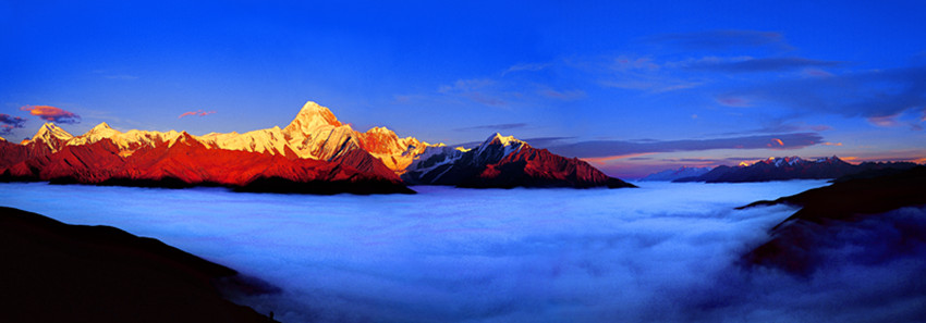 秋末冬初,雪山冰川、壯麗的高山峽谷、蒼莽的森林草甸、遼闊的高原牧場,雪山、藏寨、草場、海子、彩林繪成一幅五彩的畫卷,又是那么高遠(yuǎn)純凈。這是時間的分娩、秋天的醺醉和色彩的狂歡,紛至沓來的游客在大美甘孜,盡享太陽在藍(lán)天白云中噴薄而出那絢麗夢幻的美景。