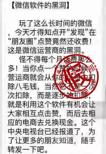 近日,微信群中流傳一條消息稱:“玩了這么長時間的微信,今天才得知點(diǎn)贊竟然還收費(fèi)。當(dāng)你點(diǎn)一個贊的時候,運(yùn)營商就會從你的話費(fèi)中扣除八毛錢……中央電視臺已經(jīng)報道了?!?/p>