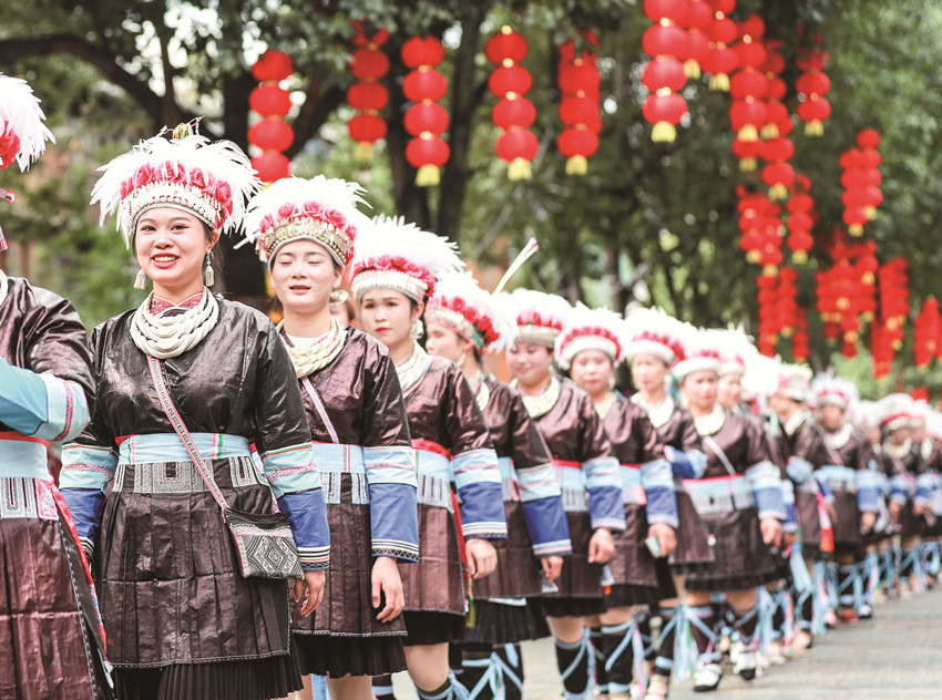 在貴州省黎平縣肇興侗寨,侗族群眾身穿節(jié)日盛裝參加侗年巡游活動。